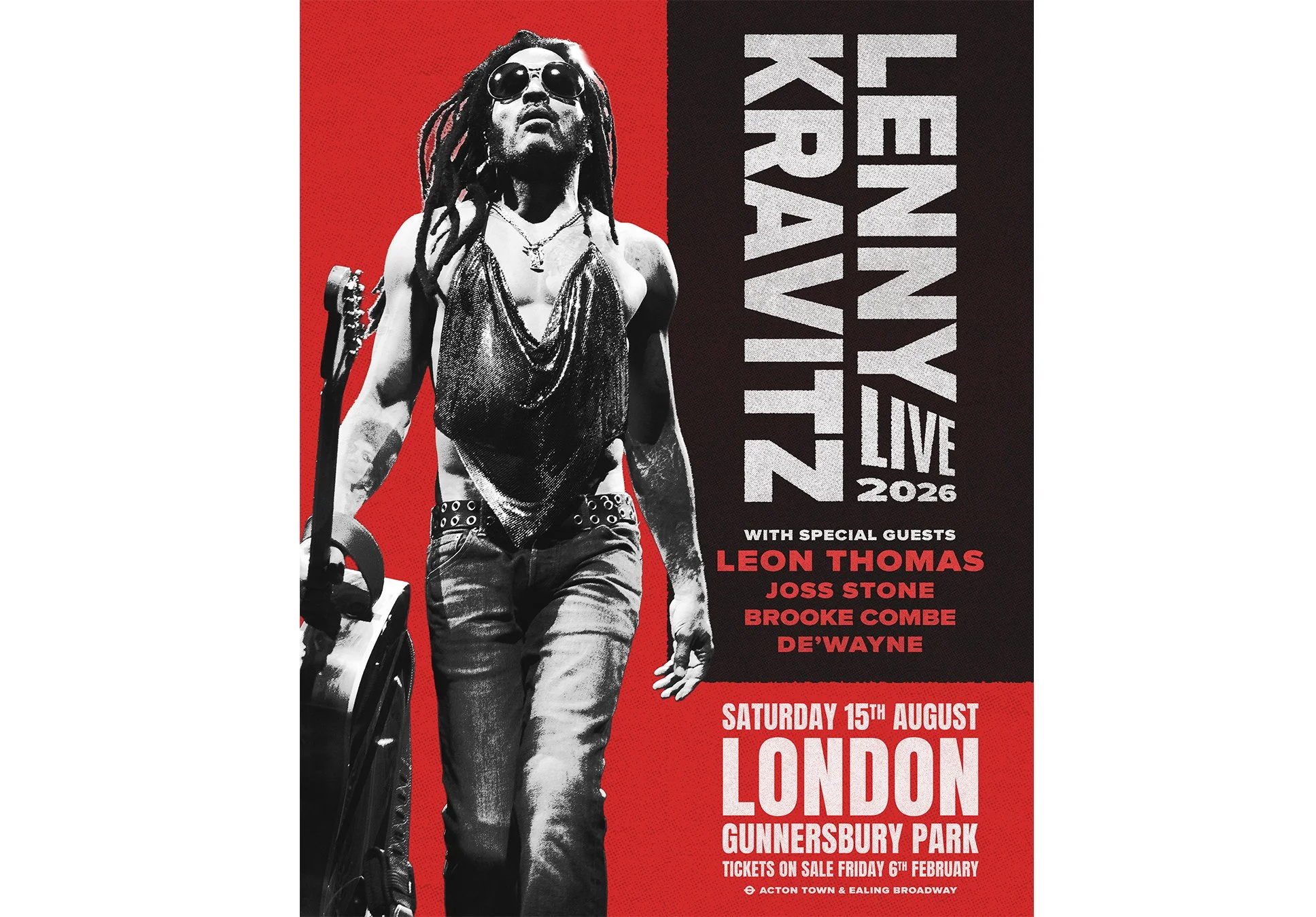 London, UK, 10:00AM Monday 2 February 2026: Today, four-time GRAMMY® Award-winning writer, producer, multi-instrumentalist and all around multi-hyphenate icon, Lenny Kravitz has announced a huge open-air show, taking place at London’s Gunnersbury Park on Saturday 15 August 2026. Joined by special guests Leon Thomas, Joss Stone, Brooke Combe and De’Wayne, the new date is part of a powerhouse live run with his Lenny Kravitz Live 2026 tour, bringing Kravitz’s celebrated live show to fans around the world.